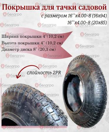 Шина (покрышка) предназначена для установки на колесо садовых тачек с размером16''x4.00-8 (16х94), 16''x4.00-8 (20х85)