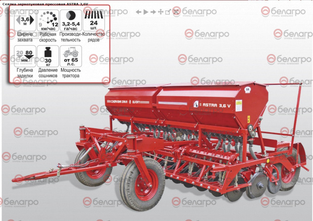 Электронная система контроля HELIOS производства НПФ «МОНАДА», установленная на сеялке, контролирует пролет семян в одном сошнике на каждом бункере и передает информацию на монитор, установленный в кабине трактора, что позволяет вести учет засеянной площади. Порошковая покраска Технология порошковой покраски гарантирует защиту от коррозии на срок не менее 8 лет. ASTRA 3,6V Сеялка позволяет при норме высева пшеницы 200 кг/га и высева минеральных удобрений 100 кг/га засевать до 3 гектаров при одной загрузке.